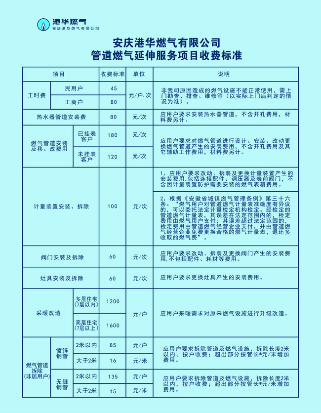 隨著安慶城市燃氣建設的快速發(fā)展,人民群眾生活水平的提高,在保障了用戶基本用氣需求的前提下,燃氣用戶對管道燃氣的延伸服務有了更多更高的要求。為滿足用戶的個性化需求,我司按照“國辦函〔2020〕129號”文件精神,結(jié)合實際情況和市場同類服務標準,按照用戶自愿、有償服務、合理收益、便于操作的原則,制定了以下延伸服務收費標準,定于2021年9月6日起執(zhí)行。