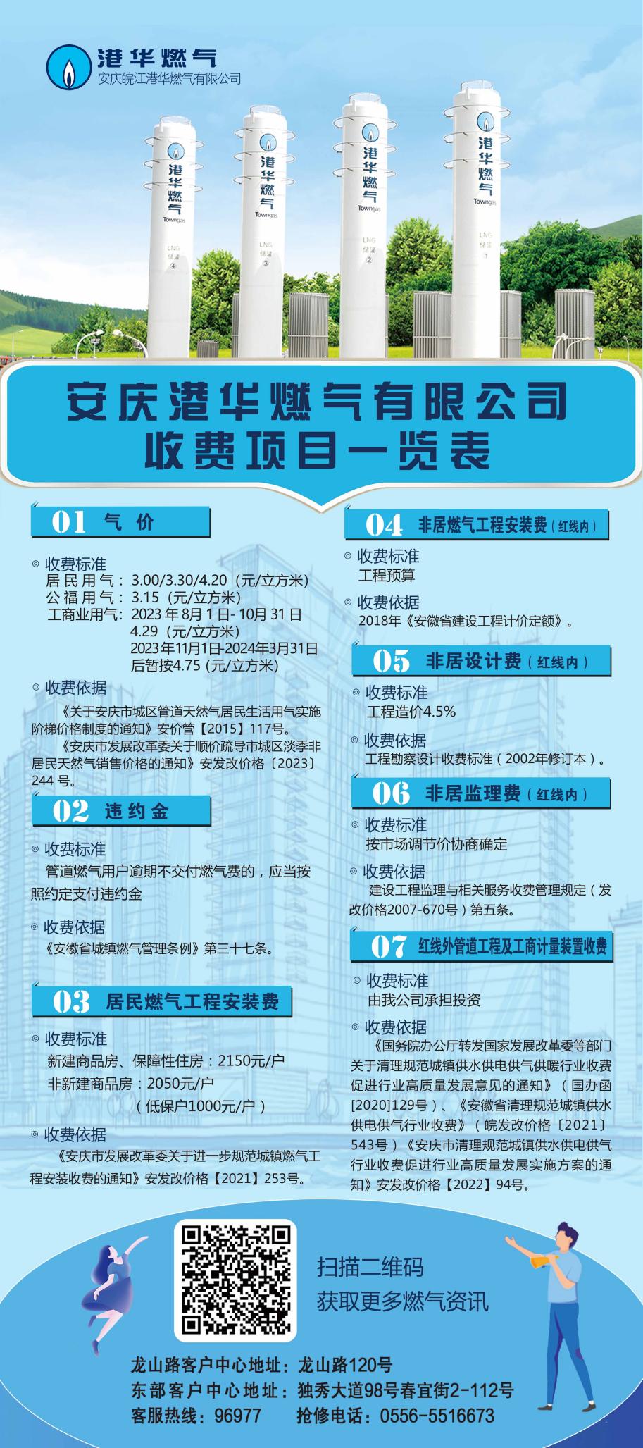 安慶港華燃氣有限公司收費項目一覽表(2023)