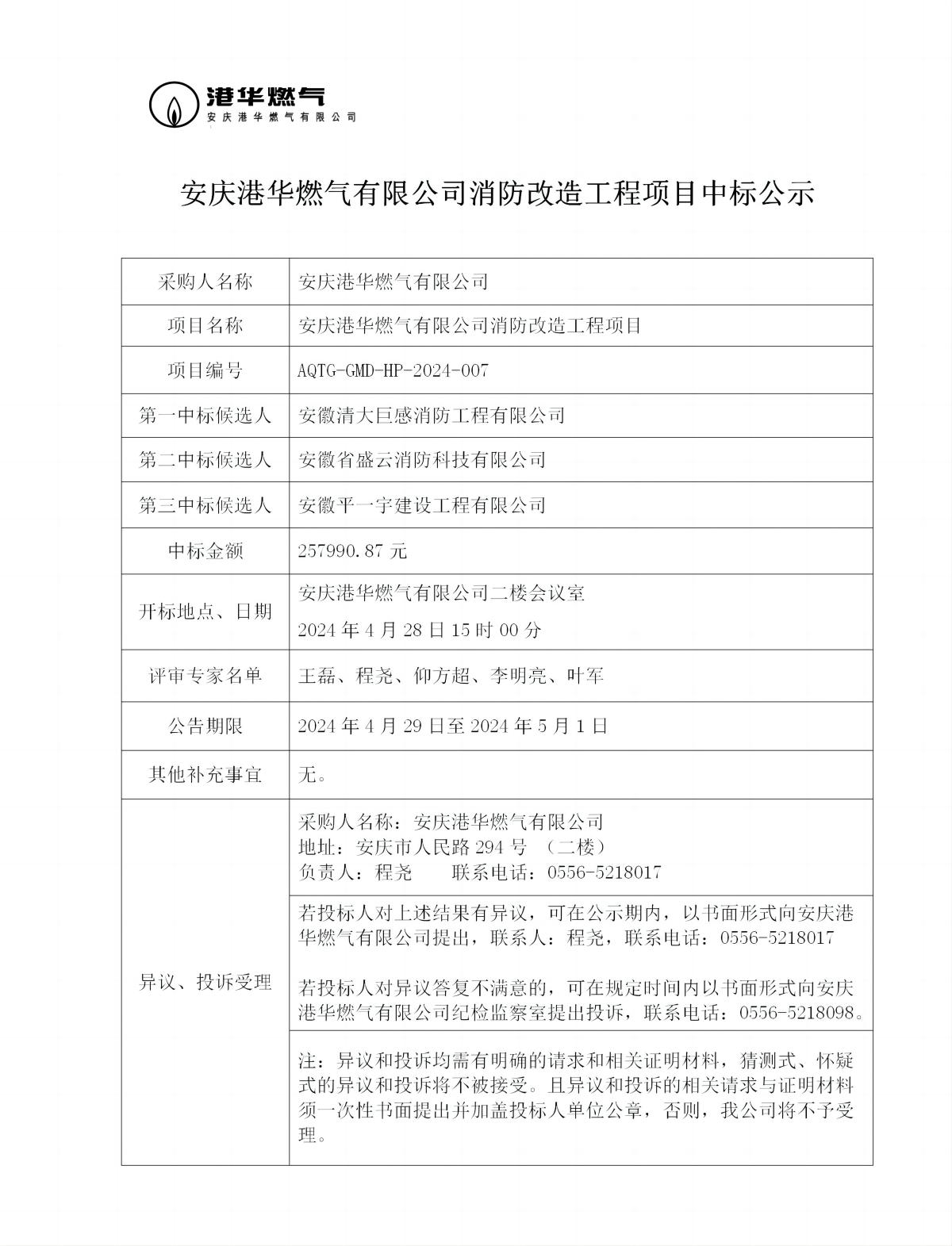 安慶港華燃?xì)庥邢薰鞠栏脑旃こ添椖恐袠?biāo)公示