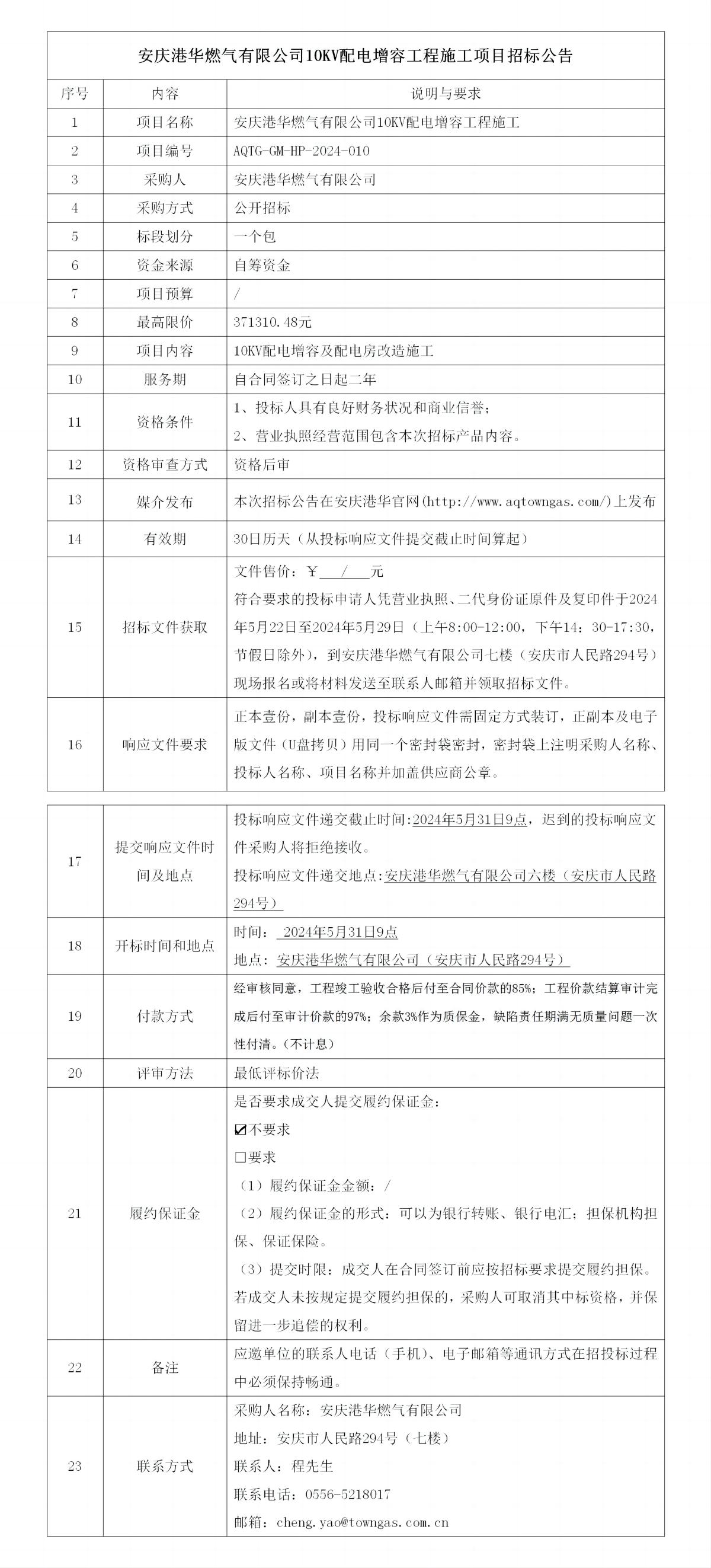 安慶港華燃氣有限公司10KV配電增容工程施工項目招標公告