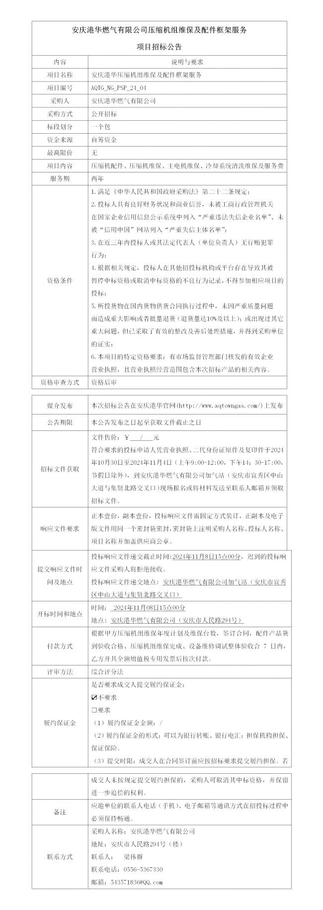 安慶港華燃氣有限公司壓縮機組維保及配件框架服務(wù)項目招標公告