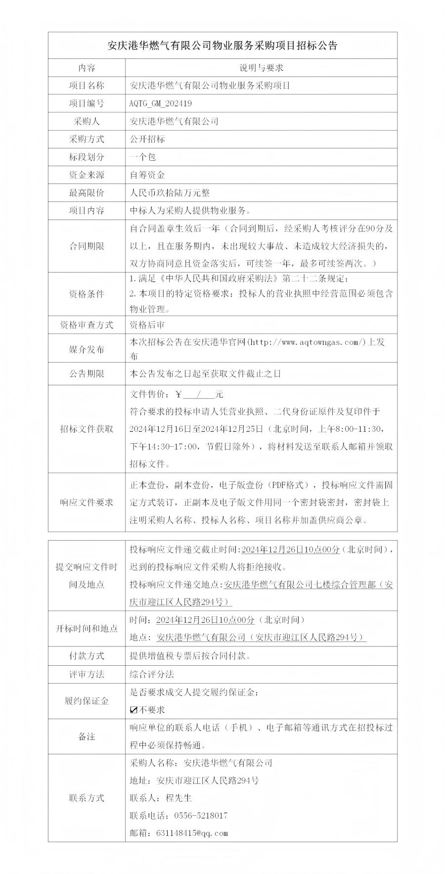 安慶港華燃?xì)庥邢薰疚飿I(yè)服務(wù)采購項(xiàng)目招標(biāo)公告