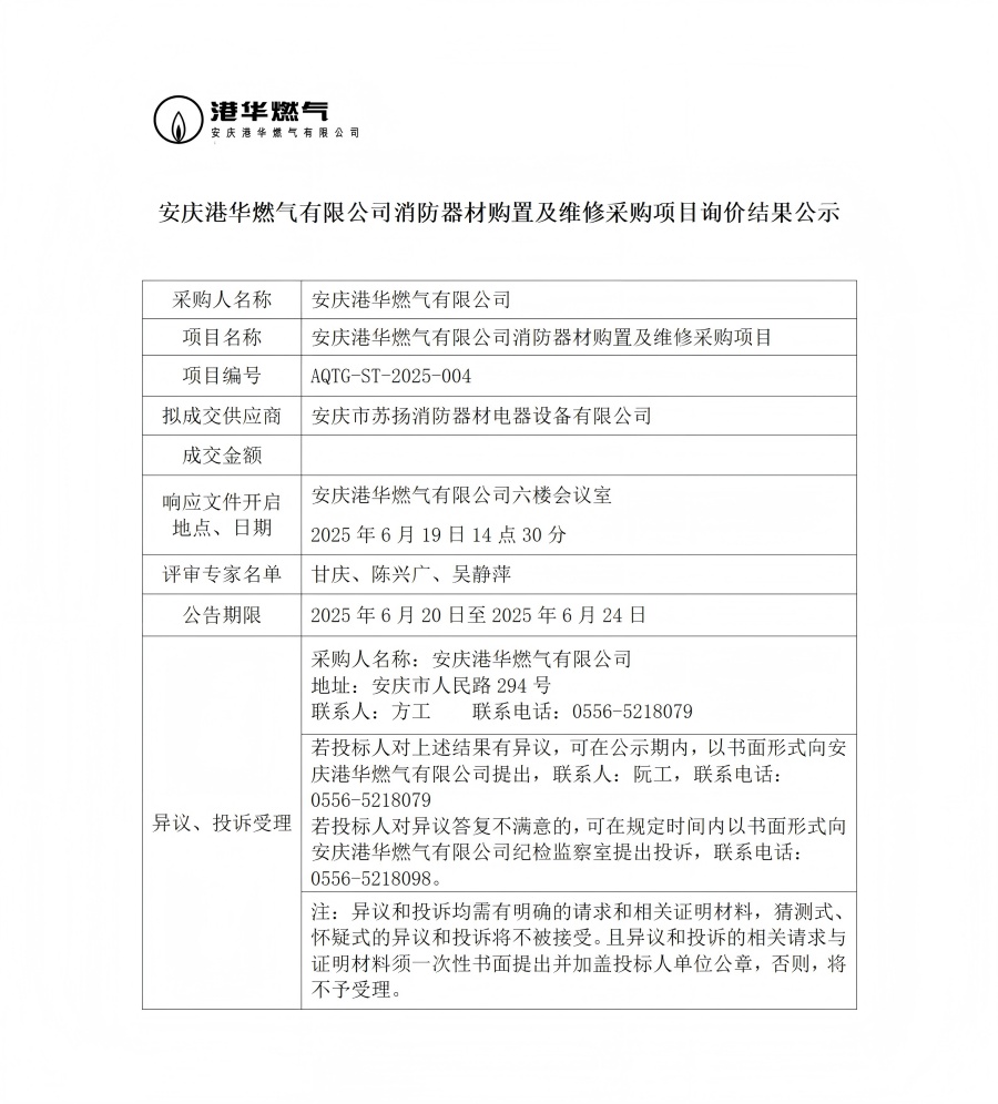 安慶港華燃氣有限公司消防器材購置及維修采購項目詢價結果公示