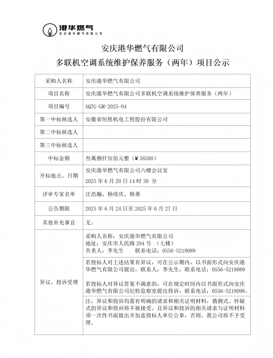 安慶港華燃?xì)庥邢薰径嗦?lián)機(jī)空調(diào)系統(tǒng)維護(hù)保養(yǎng)服務(wù)(兩年)項(xiàng)目公示