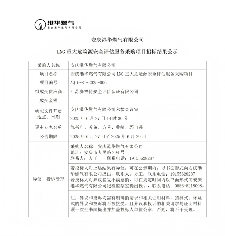 安慶港華燃氣有限公司LNG重大危險源安全評估服務(wù)采購項目招標結(jié)果公示