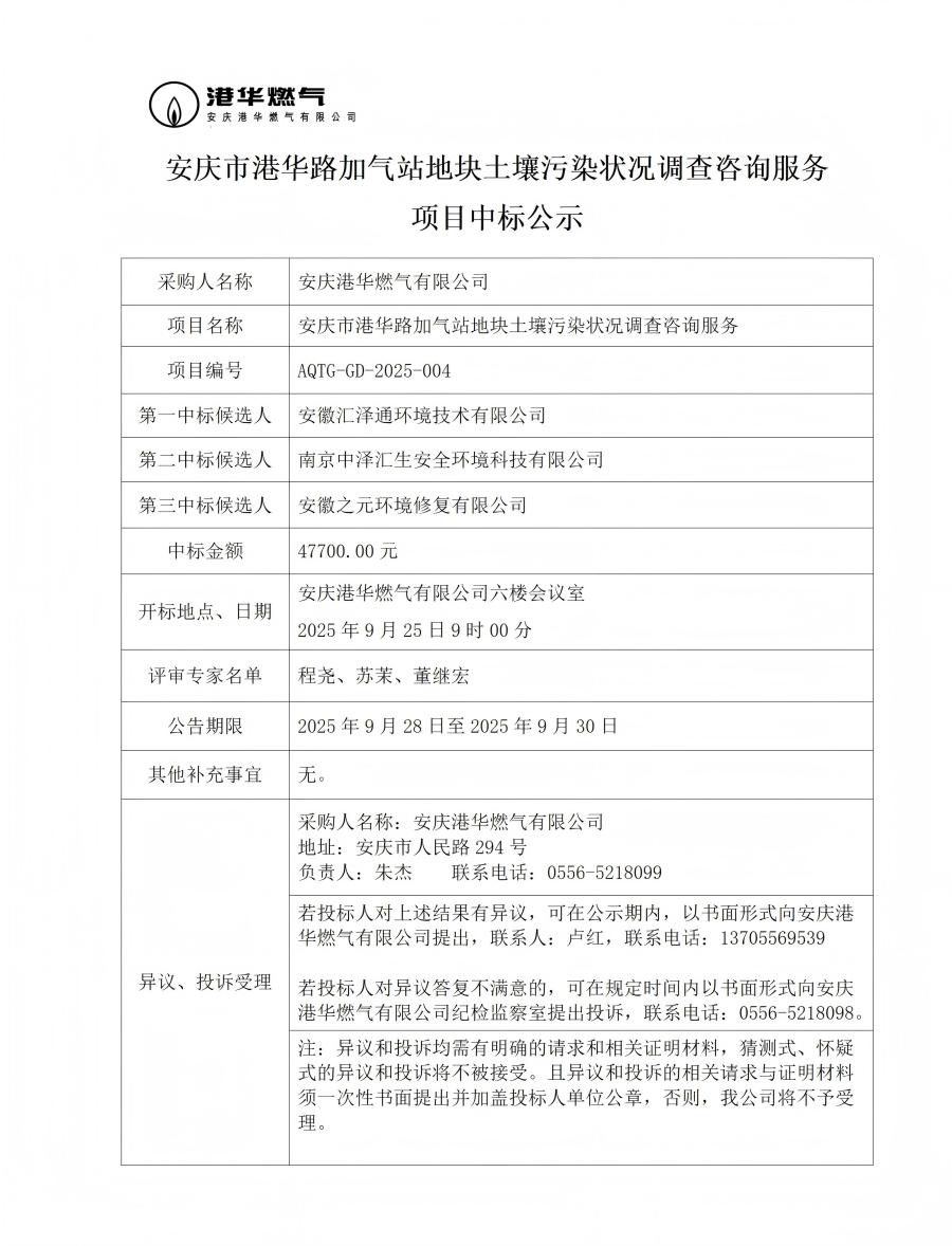 安慶市港華路加氣站地塊土壤污染狀況調(diào)查咨詢服務(wù)項目中標公示