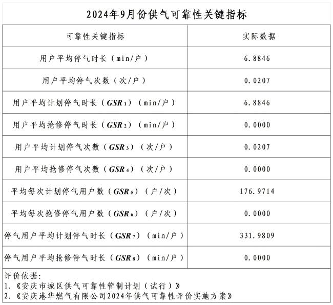 2024年9月份供氣可靠性關(guān)鍵指標(biāo)